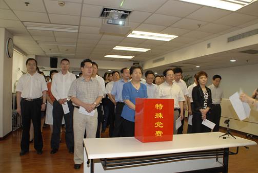 5月27日上午,国寿养老保险公司党委组织总部全体党员举行“党员缴纳特殊党费,支援抗震救灾”活动。活动由张惠敏同志主持,王伟、杨帆、白平、苗复春同志出席。组织关系在养老保险公司的77名党员缴纳了特殊党费,款项合计333800元。至此,养老保险公司总部员工已为地震灾区捐款492400元。
